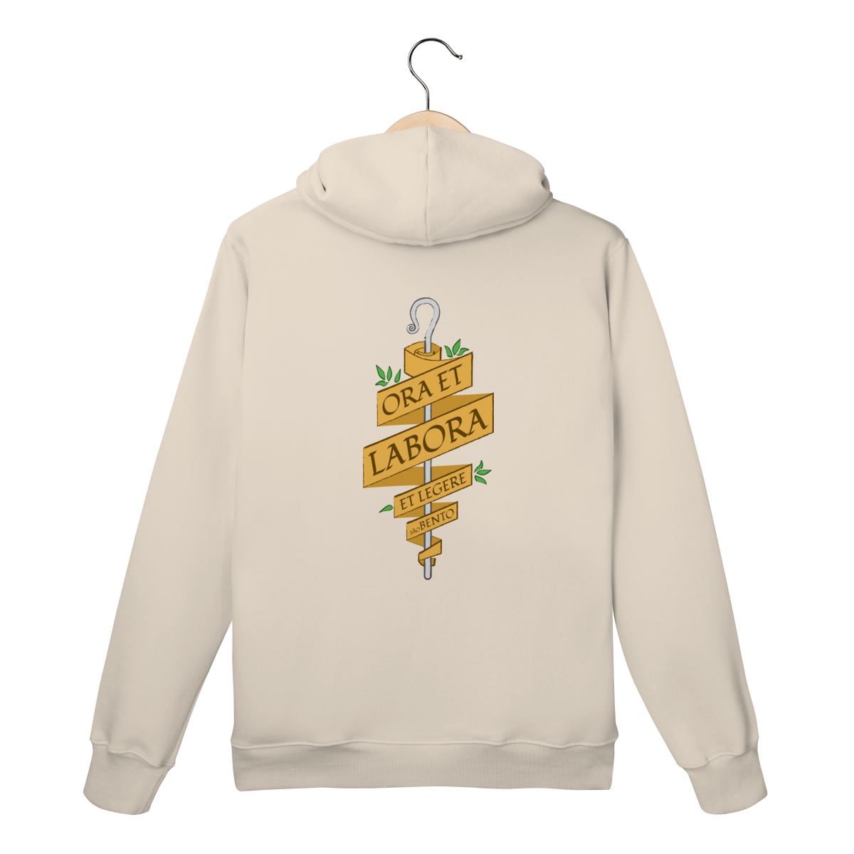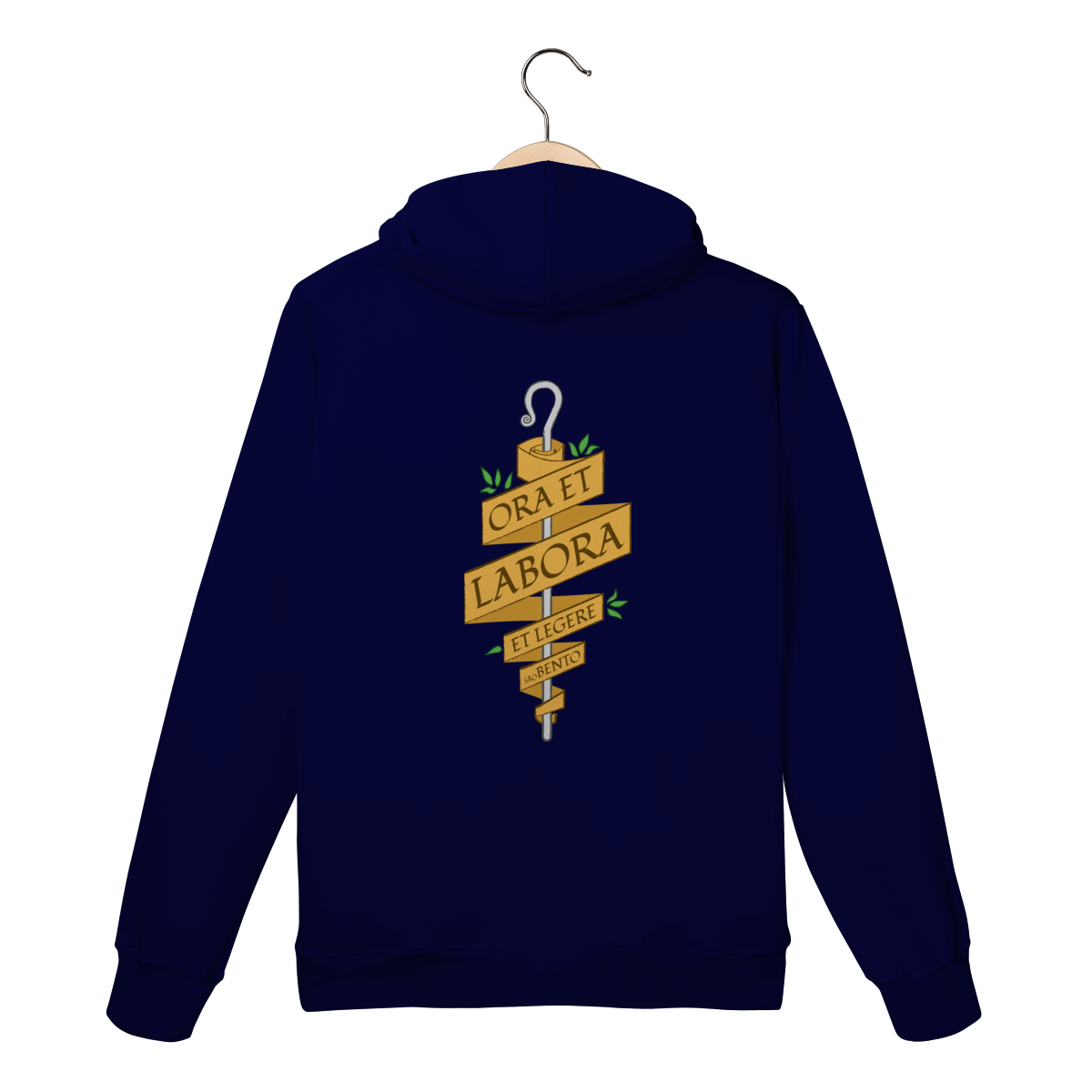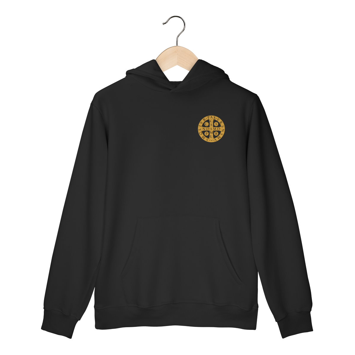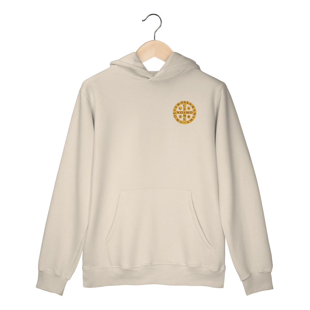 São Bento de Núrsia (480-547) propunha um tripé na vida dos monges: “Ora et labora et legere”: que podemos traduzir por “reze, trabalhe e estude”. Na frente do moletom, temos a Medalha de São Bento. Na cor capim dourado.