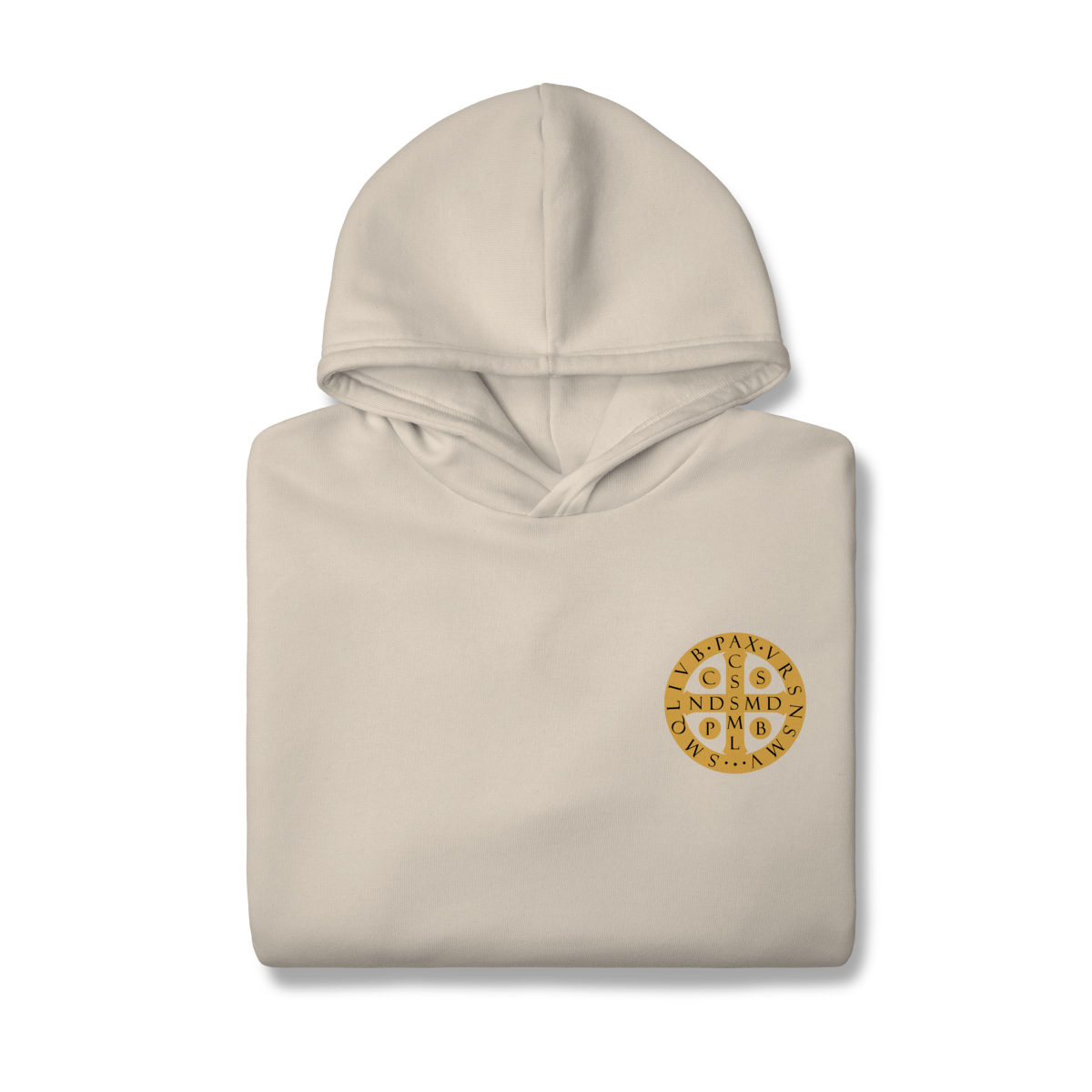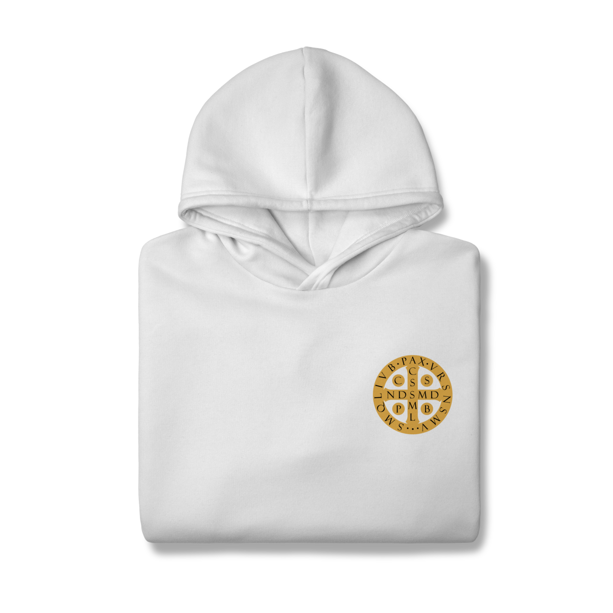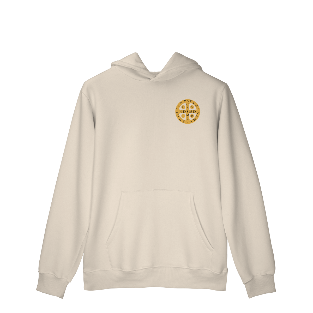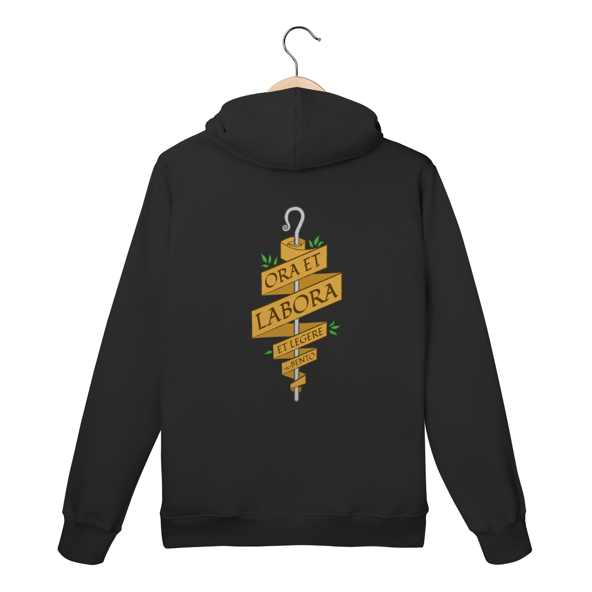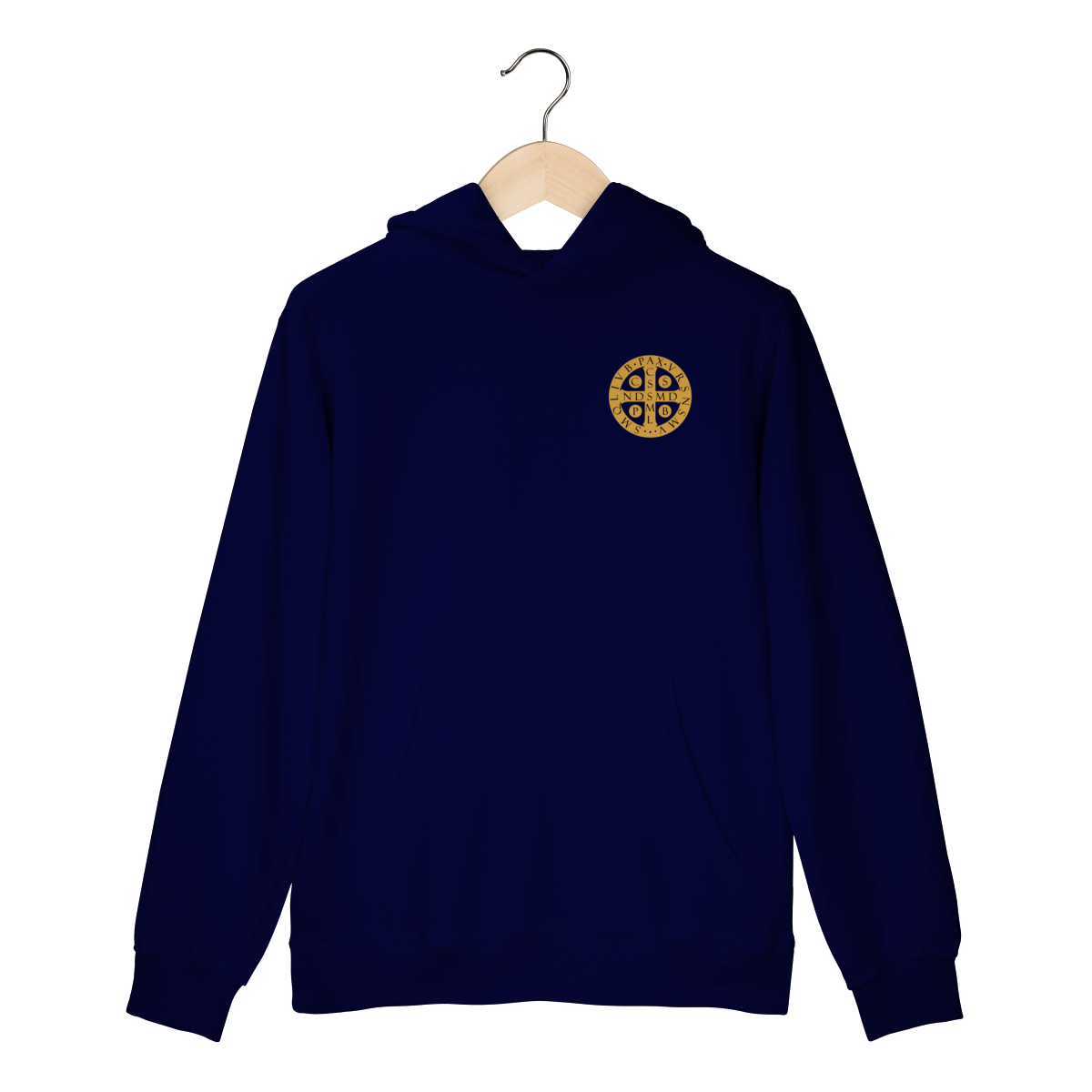 São Bento de Núrsia (480-547) propunha um tripé na vida dos monges: “Ora et labora et legere”: que podemos traduzir por “reze, trabalhe e estude”. Na frente do moletom, temos a Medalha de São Bento. Na cor capim dourado.