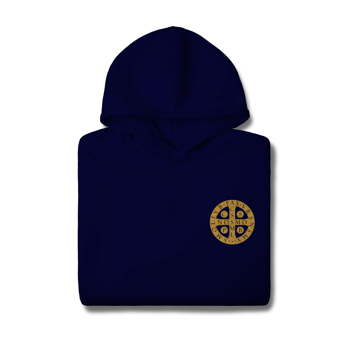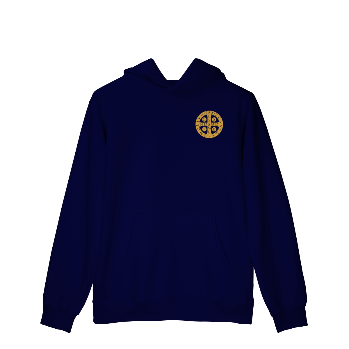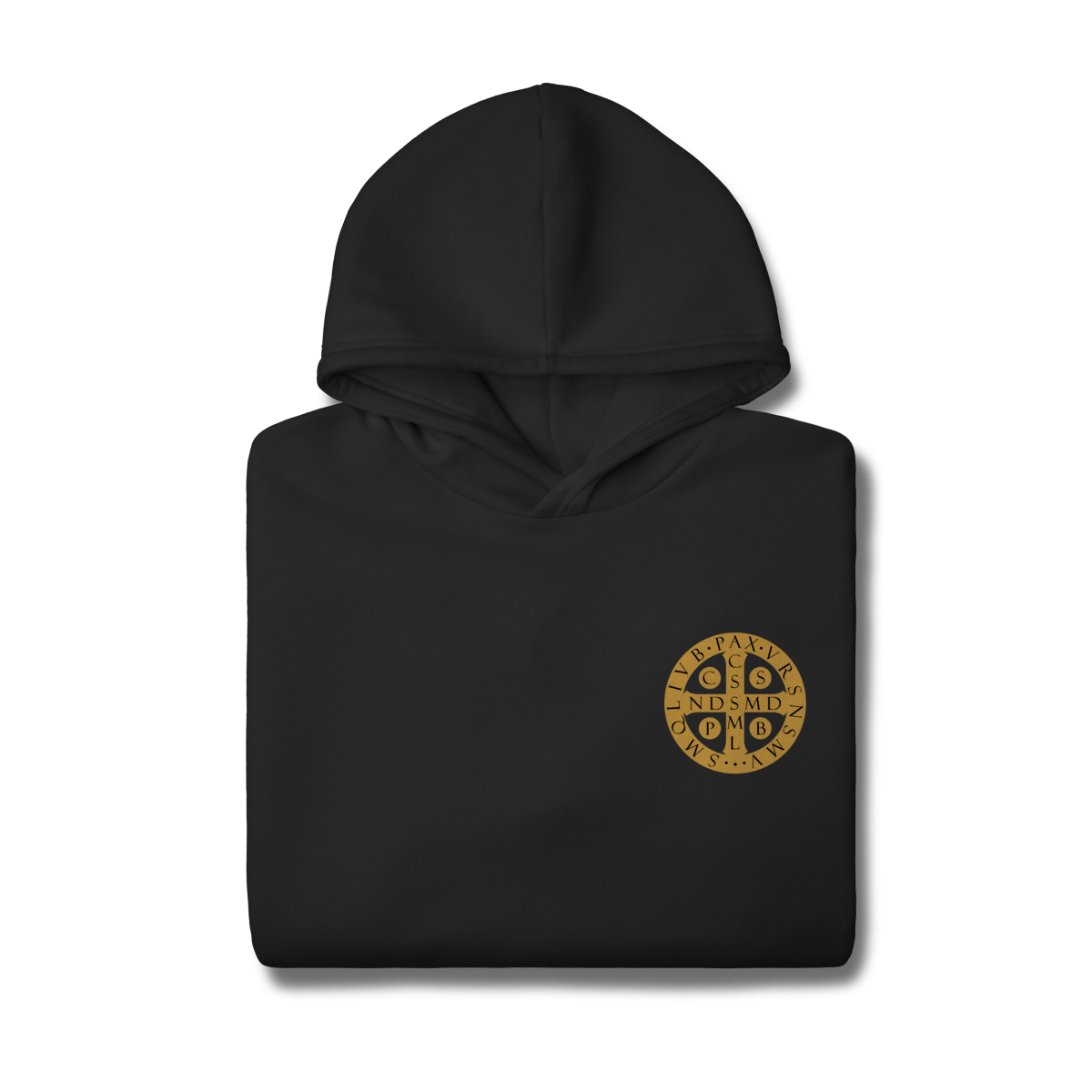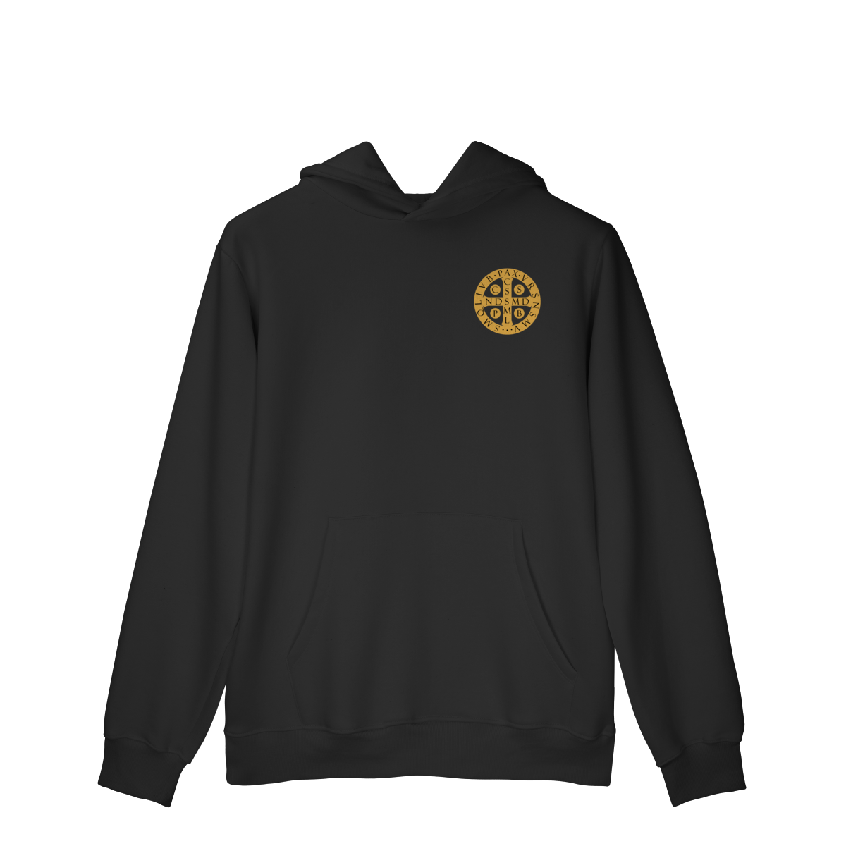 São Bento de Núrsia (480-547) propunha um tripé na vida dos monges: “Ora et labora et legere”: que podemos traduzir por “reze, trabalhe e estude”. Na frente do moletom, temos a Medalha de São Bento. Na cor capim dourado.